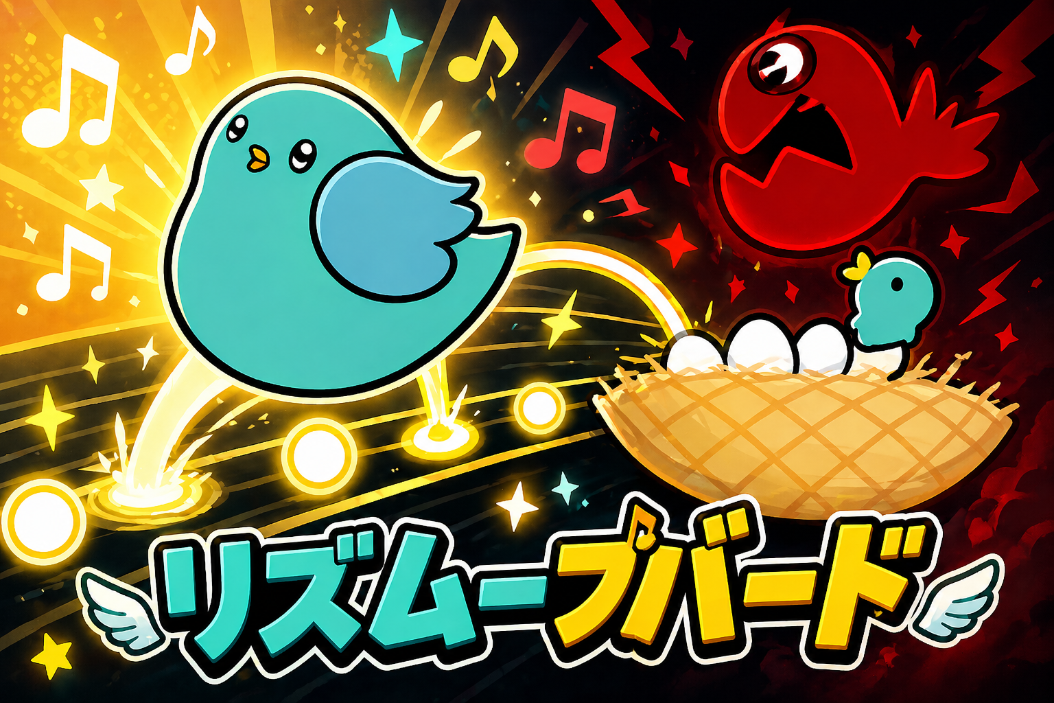リズムに乗って青い鳥を動かし、雛(ひな)のもとを目指すブラウザゲームです。 シンプル操作で、音に合わせてタイミングよく入力して進みます。 リズムを外すと前進しにくくなるため、目と耳でテンポをつかむのが攻略のコツです。 ぜひ気軽に遊んでみてください!